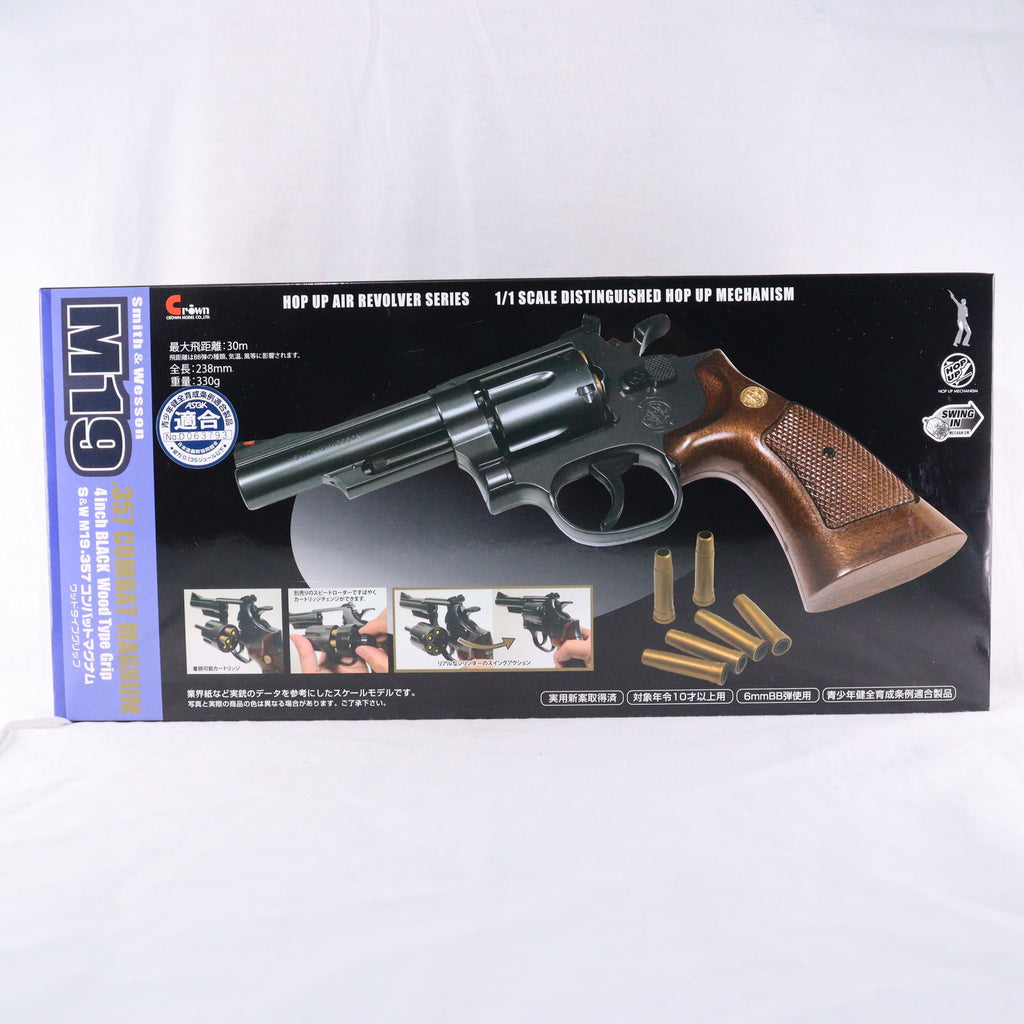 ■タイトル:クラウンモデル ホップアップエアリボルバー S&W(スミスアンドウエッソン) M19 .357マグナム 4インチ ブラック ウッドタイプグリップ(2024年価格改定版) (10歳以上専用)