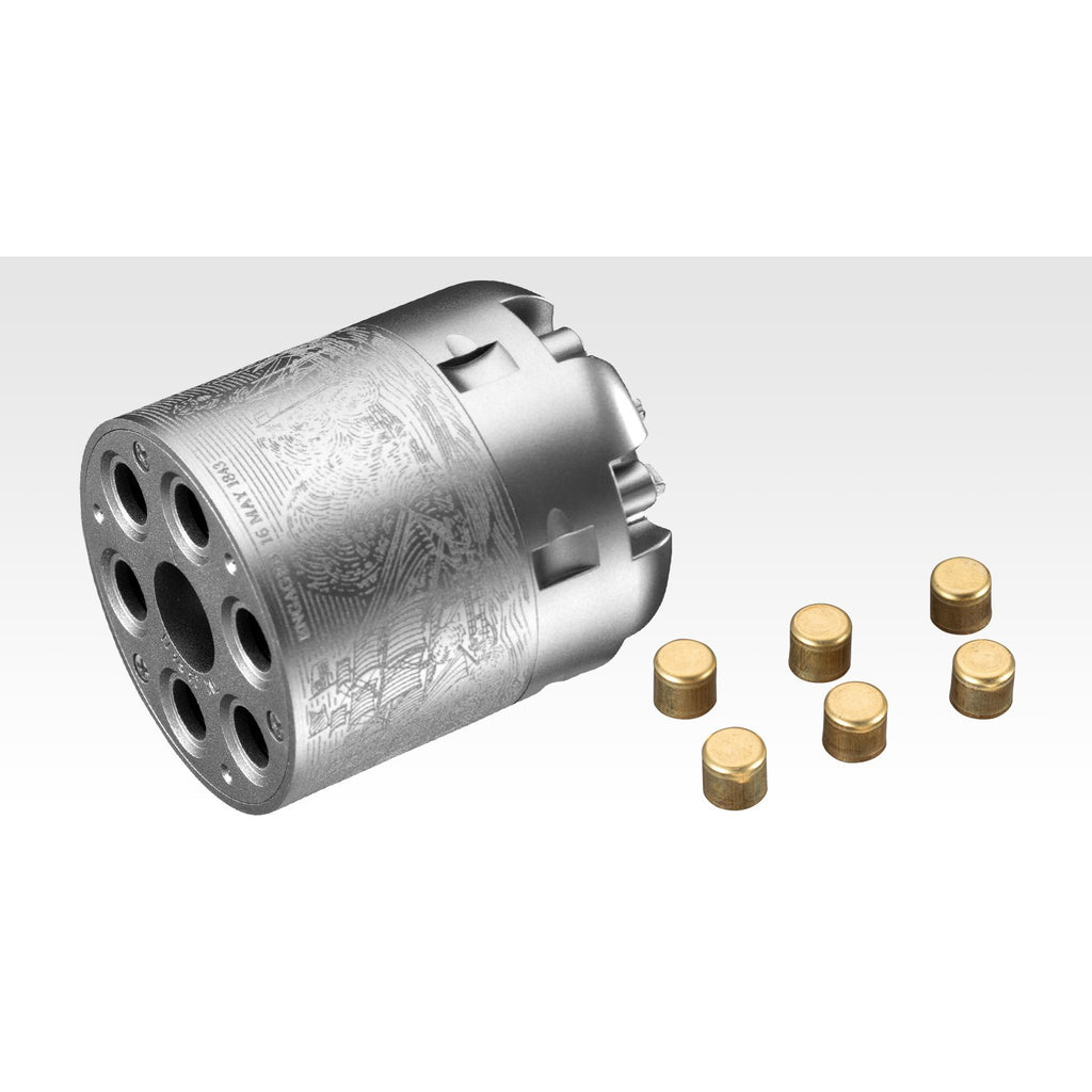 シリンダーには真鍮製のパーカッションキャップを取り付けることができ、弾をシリンダーに込める一連の操作プロセスが楽しめます。