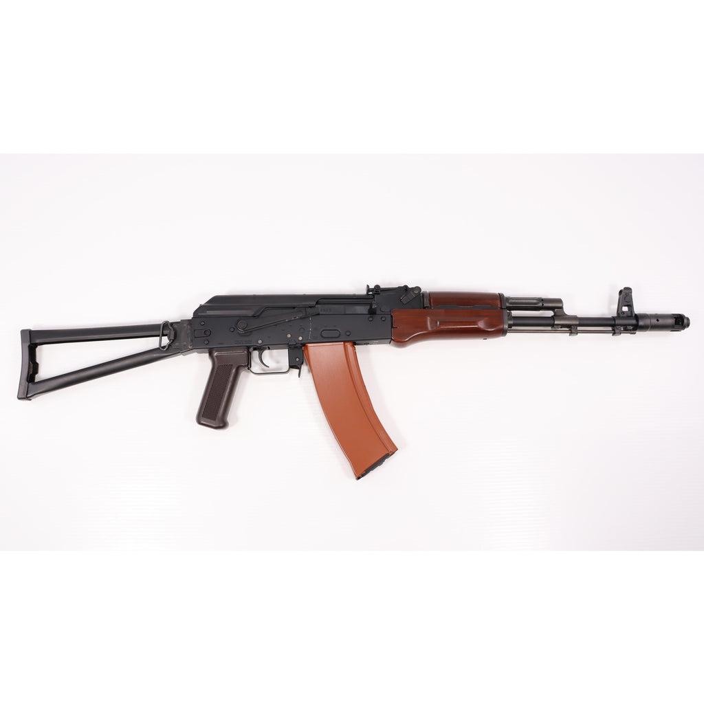 折りたたみ式ストックをもつAKS74Nは、限られた場所での取り回しや移動力を必要とする部隊の携帯性を高め、ナイトビジョンを搭載するためのサイドマウントベースを装備した、AK74ベースのバリエーションモデルです。